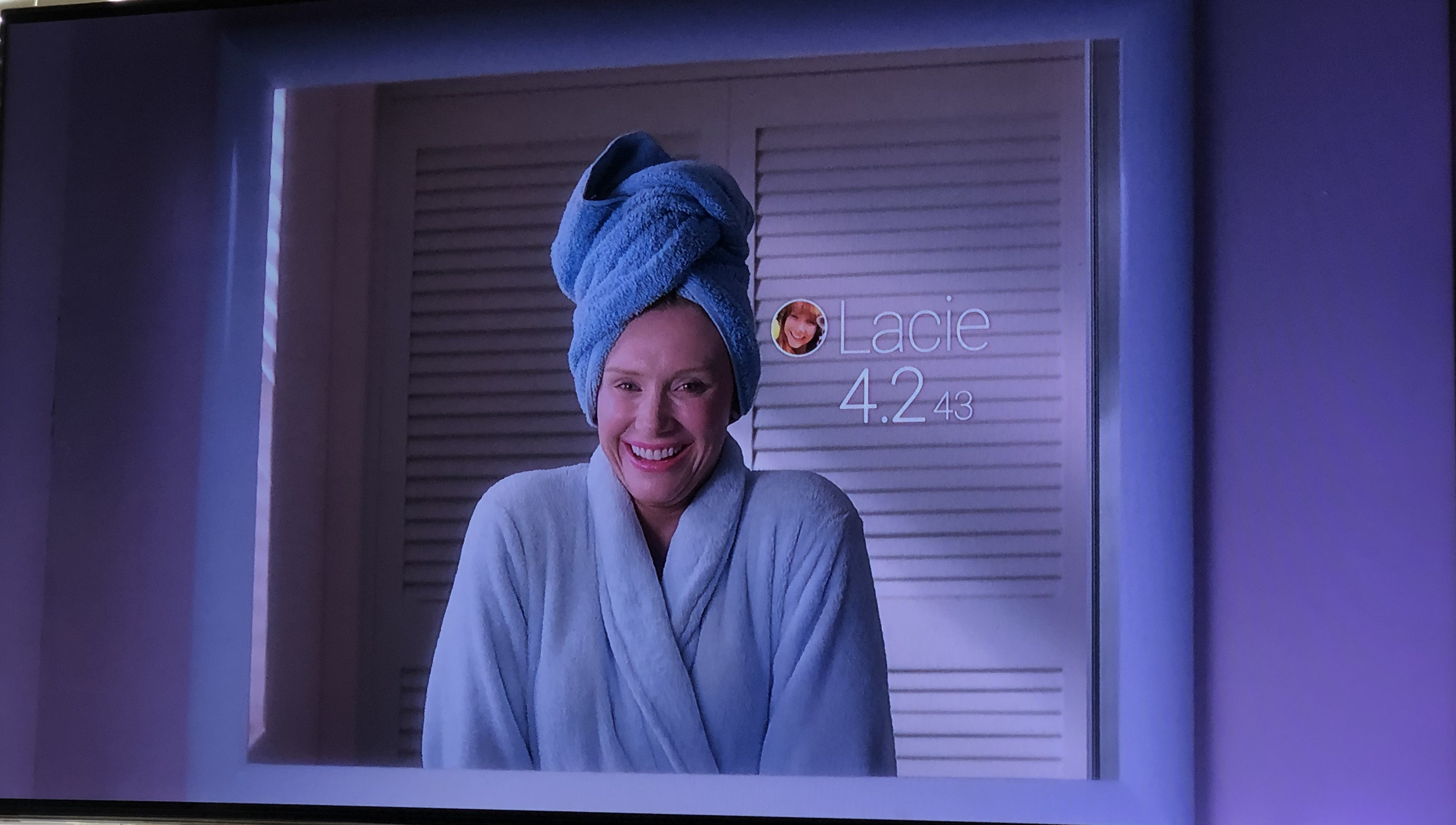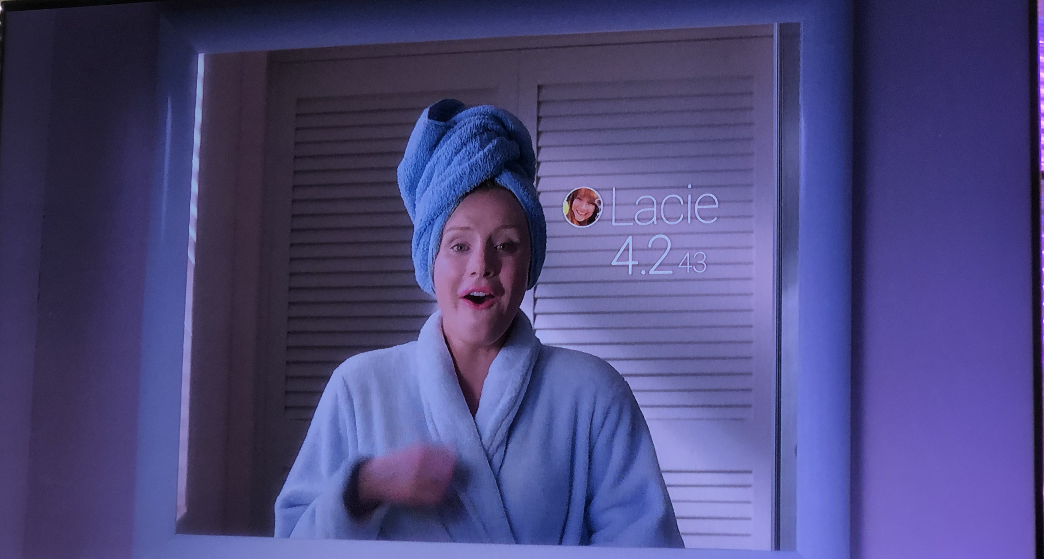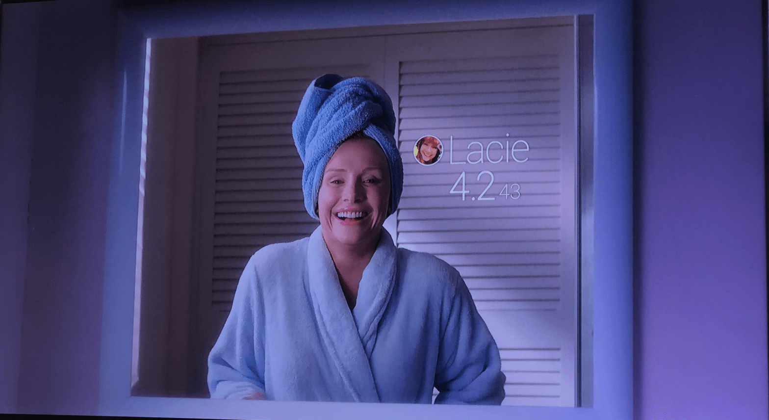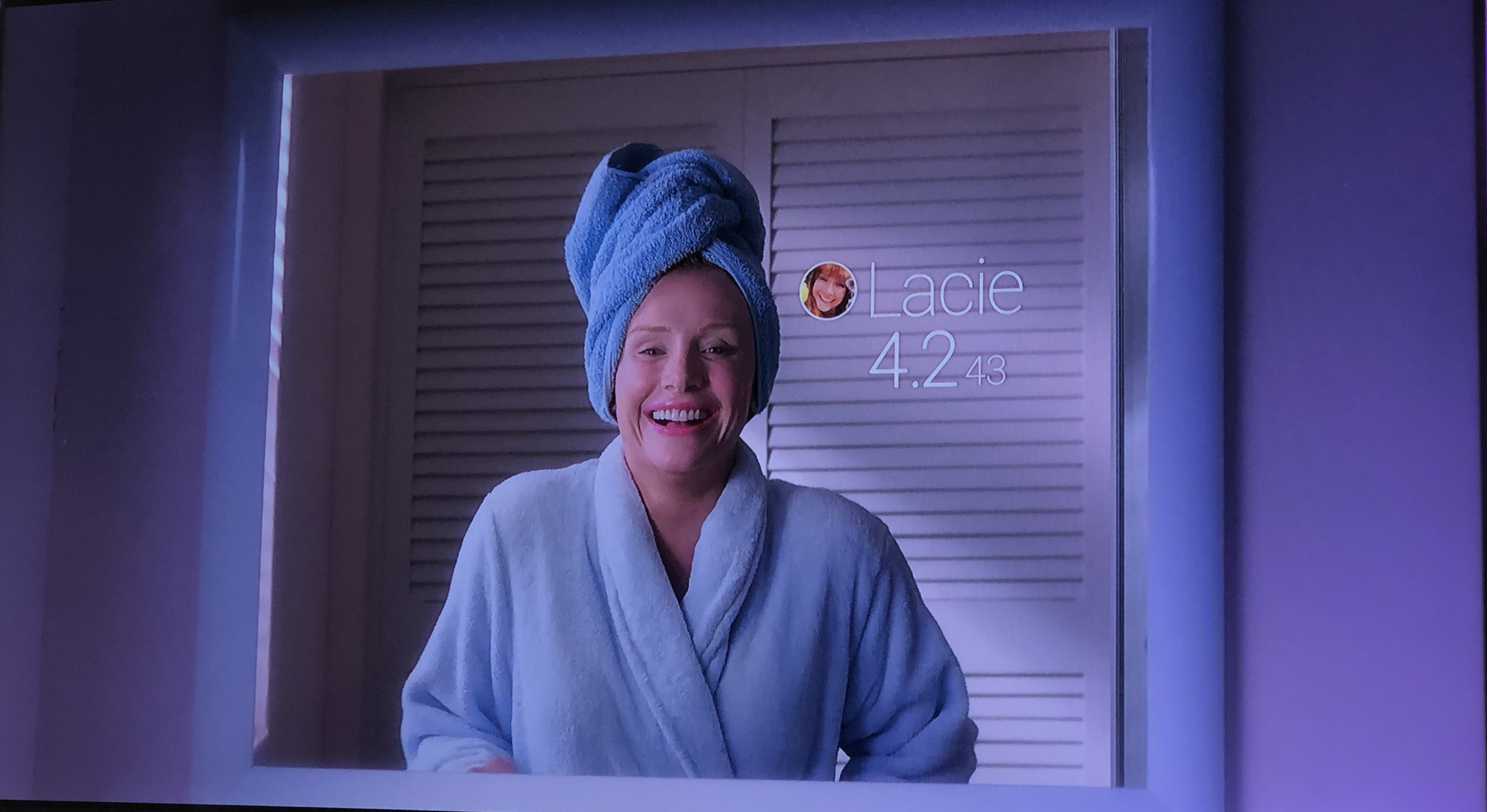 In Lacie’s reality is strongly discourage to be rude or pushy to others. You will be denied service, purchase, or even a living space. Other people point their phone at people and rate them.